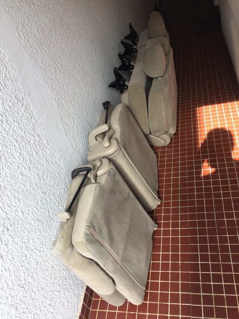 In our driveway, Eeyore was taken apart to properly clean it and then convert it into an overlander. She was filthy! 10 years of grime and dirt from Tunis and Abidjan and no proper cleaning had left their traces. Additionally the interior is beige, where every spill and dirt stain clearly shows. I also stroke luck and am now rich! While cleaning I found 90 Tunisian millimes, about 2.8 Euro cents, worth of coins. Now it is time for a proper shampoo and scrub over the weekend! Part two of the TLC programme.