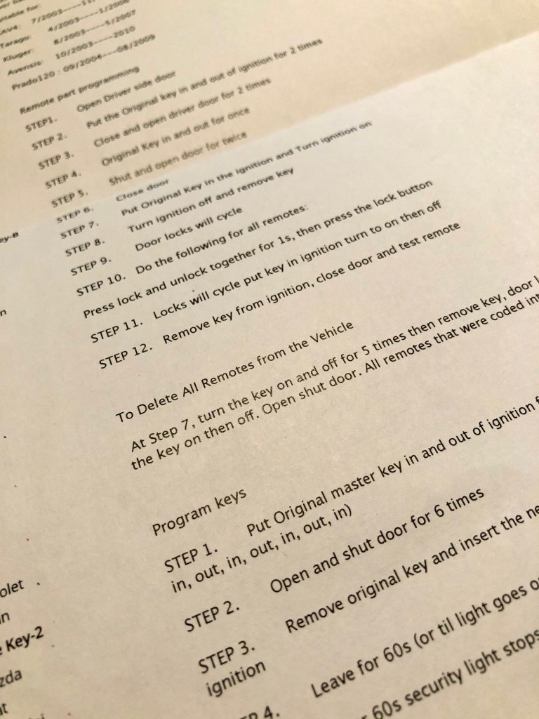 Today to the bewilderment and later amusement of the guard, Ulrich performed the key & door dance. The new key had to be programmed to Eeyore so that the remote would work and that the immobilizer system of the car recognises the key as a genuine one to then start the engine. Following the instructions that came with the keys on the AliExpress’ website very closely:
