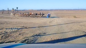 The night was not as cold as the previous, but still quite chilly. The rising sun warmed everything quickly. While having breakfast, we packed up, said goodbye to the neighbours and hit the road. We did not even leave the hotel and already had to encounter the first obstacle. A caravan of 14 dromedaries,led by three men, crossed our path on their way into the dunes to welcome the tourists for a ride.