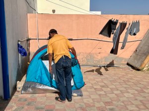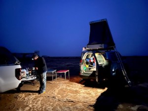 The only camping in town is near the corniche. It looks neglected and has certainly seen better days. But it will do for a night and the toilets and showers are clean and functional. We have free choice and opt for a spot out of the strong northerly chilly wind. Brahim chose the far back wall of the car wash port as his place to set up camp. Eeyore will stand in front of the car wash port as it is more level and Charlotte & Trevor have opted for a very simple twin bed room, as they feared that their huge tent would be blown away in the strong winds.