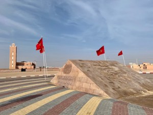 In the middle of nowhere lies the village of Tah. This place is the former border post between the former colony of ’Spanish Sahara’, nowadays the southern province of Morocco and the northern Kingdom of Morocco. In 1975, the Green March marched pass this place. In memory of this March and occasion, the government has erected a large memorial in honour of the late Moroccan Kings Hassan I. and Hassan II.We stopped at the monument that lies in the middle of a roundabout. Quickly, I noticed that something was different. A quick search in my pictures from a month ago, I saw the difference immediately. Most likely for the celebration of the 48th anniversary of the Green March on November 6th, they had transformed and beautified the place by placing a large sign in the middle, removed the old traces of the road leading through the middle and repaved the entire square with new stones in a geometrical pattern. The Moroccan flags were still flying in the wind. After having taken pictures and looked at the two monuments, we carried on.