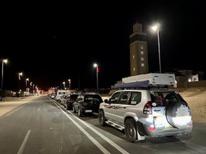 Trevor was standing outside with his paperwork sorted and paying his fixer while the sun had set and hundreds of people, travelers, fixers, officers and merchants, were buzzing around you, a relief came over me. We had done it. We had managed to pass through this border crossing in time to make it to a wonderful spot in Nouadhibou tonight. We set off and drove in the fading light the about 45 kilometres to the lodge, where we will spend the next two night. Tomorrow is a day to relax and recharge our batteries as this day has really taken its toll on us and has worn us out. The sun, the heat, the uncertainty when would the queue move again and we could finally enter the border station, can we quickly go to the toilet or get some food or will the queue move on at just that moment, the uncertainty if we would make it across in time or have to camp in no-man’s-land for the night, the frustration of yet another process to complete and more stamps to collect and then those pesky fixers sticking to you like flies on honey.