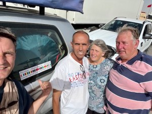 He also didn’t find much and we were allowed to repack the cars. We did so very quickly, as it now became a race against the clock. We drove to the exit to only hear that we needed another stamp on all the documents. Into the main building we literally ran, to be forced to wait in front of an office where our papers would again be scrutinised, registered in the computer system and then eventually stamped. The two officers, a young and and older one, did their best, but also had to administer all the documents, such as bill of lading, from the trucks passing through the border. The older officer was, however, more focused on killing the many flies with his self-made whacker than processing the documents. Many precious minutes passed and finally we got our stamps, raced back across the customs area to our cars, handed them in at the appropriate booth, just to be stopped again for two more passport checks and registration that we had left the border post. FINALLY OUT!