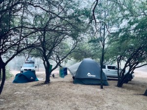 A foggy morning at Zebrabar that got thicker by the hour. We had breakfast and wanted to pack up our gear. A lot of gear, such as the tents, chairs and tables, was damp. A fast wipe and they were ready to pack. In the morning, while cleaning up, Alex came to me and apologised. He had just broken the tap of one of the water jerry cans. I wasn’t happy, but we had another jerry can we could use. Not even two minutes later, I wanted to clean my breakfast bowl and bang! The other tap had also broken off. The plastic must have become brittle from the heat and UV light. We laughed as it also made Alex feel better that the same thing happened to me. Trevor, the legend, offered us a tap from one of his jerry cans that are the same made. Now we can at least tap water again from one jerry can. Many thanks Trevor! On our way out we stopped at the reception, met Ursula again who was just adding up our telly. Ursula informed me that she was expecting 78 Dutch rally participants to night as well as an overlander bus with twenty odd people. It was a wise coincidence to leave today. We said our goodbyes to the various overlanders, we had become friendly with, before we paid and left.
