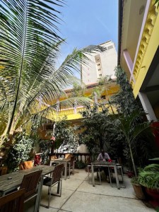 The two friendly ladies at the reception of the hotel had a good look in their good old hand-written reservations book. Yippeah, two singles and a double were still available for two nights. One of the ladies swiftly helped to organise some parking across the road on an empty plot, just as Trevor came around the corner still looking for parking. Swiftly he was directed into the organised parking. Afterwards I ran down the street to fetch Eeyore, while I found Alex in the bakery donut shopping to please the parking warden outside. What a legend. I gave the warden some change and ordered Alex back out to take him and the car to the parking opposite the hotel. After filling in the checkin forms, we were shown the rooms. Two upstairs and mine downstairs. All rooms are accessible from the inner courtyard, that features many tropical plants. In the middle and at one side of the ground floor, it has a small restaurant.