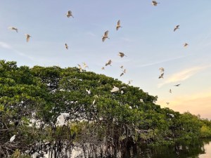 As the sun was setting rapidly, we moved on to the other tourist attraction in these waters. The bird island. In actual fact, it is a number of mangrove trees forming an island, that has been chosen by a few hundred birds as their resting place for the night. There they cannot be bothered by monkeys.
