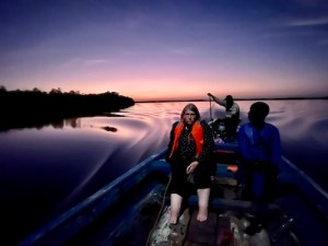 Trevor stayed behind and so, Charlotte, Alex, the guide and me left camp in our cars at four o’clock. Across the fields again, down the sandy tracks, passing under several low hanging branches of mango trees, and through a village, we arrived in another camp. The vehicles were securely parked, while we waited for the boatsman to refill the pirogue’s tank.