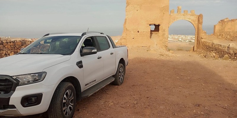 Our first stop was to visit an old French fort on the hillside above the town of Mirleft (we had camped there on the way down). It was easy to find with Google map navigation but the final 50-100 metres was quite steep and very rough and rocky, but we put the car into 4 wheel drive and slowly drove up with ease. The fort is a complete ruin with only a few walls, a tower and the entrance gate still standing. It nevertheless gave some good photo opportunities as well as wonderful view over the town and sea below.